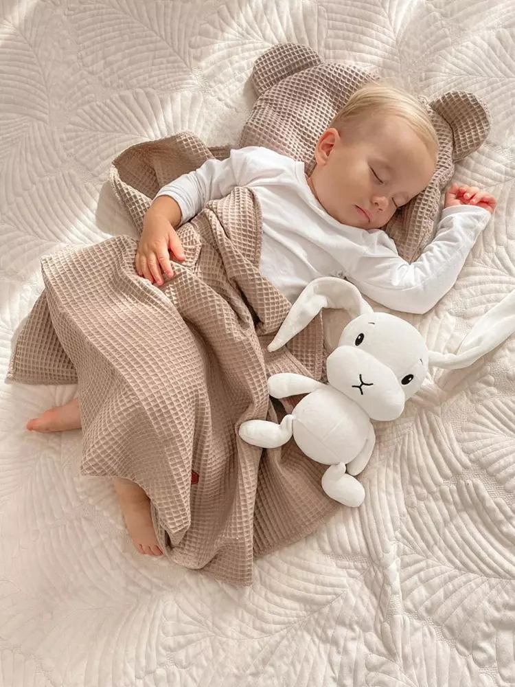 Szukasz lekkiej, oddychającej alternatywy dla pościeli na ciepłe dni? Nasz bawełniany kocyk wafelkowy z uroczą poduszką w kształcie misia to strzał w dziesiątkę! Idealny od pierwszych dni życia – do łóżeczka, wózka, kosza Mojżesza czy jako mata do zabawy.